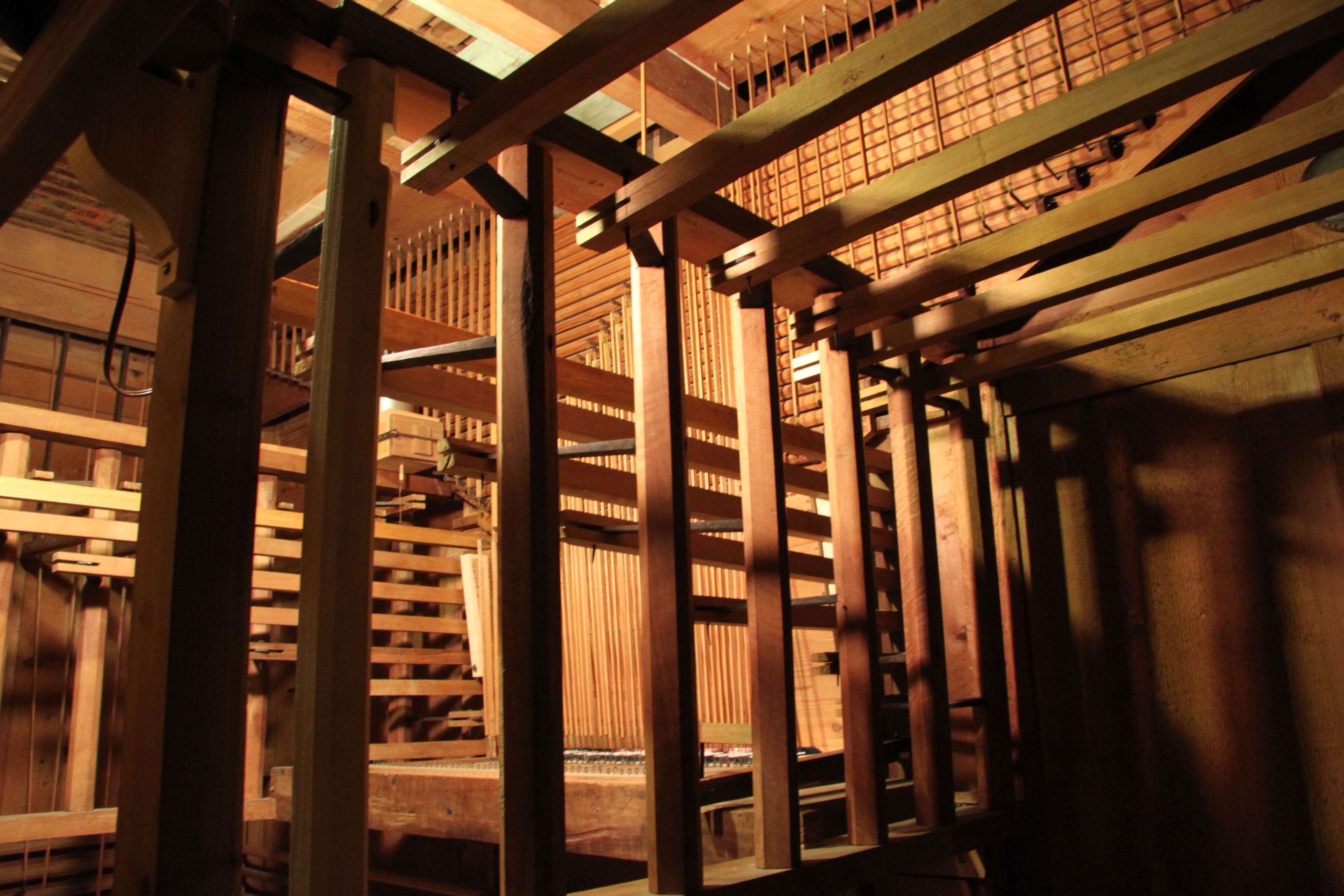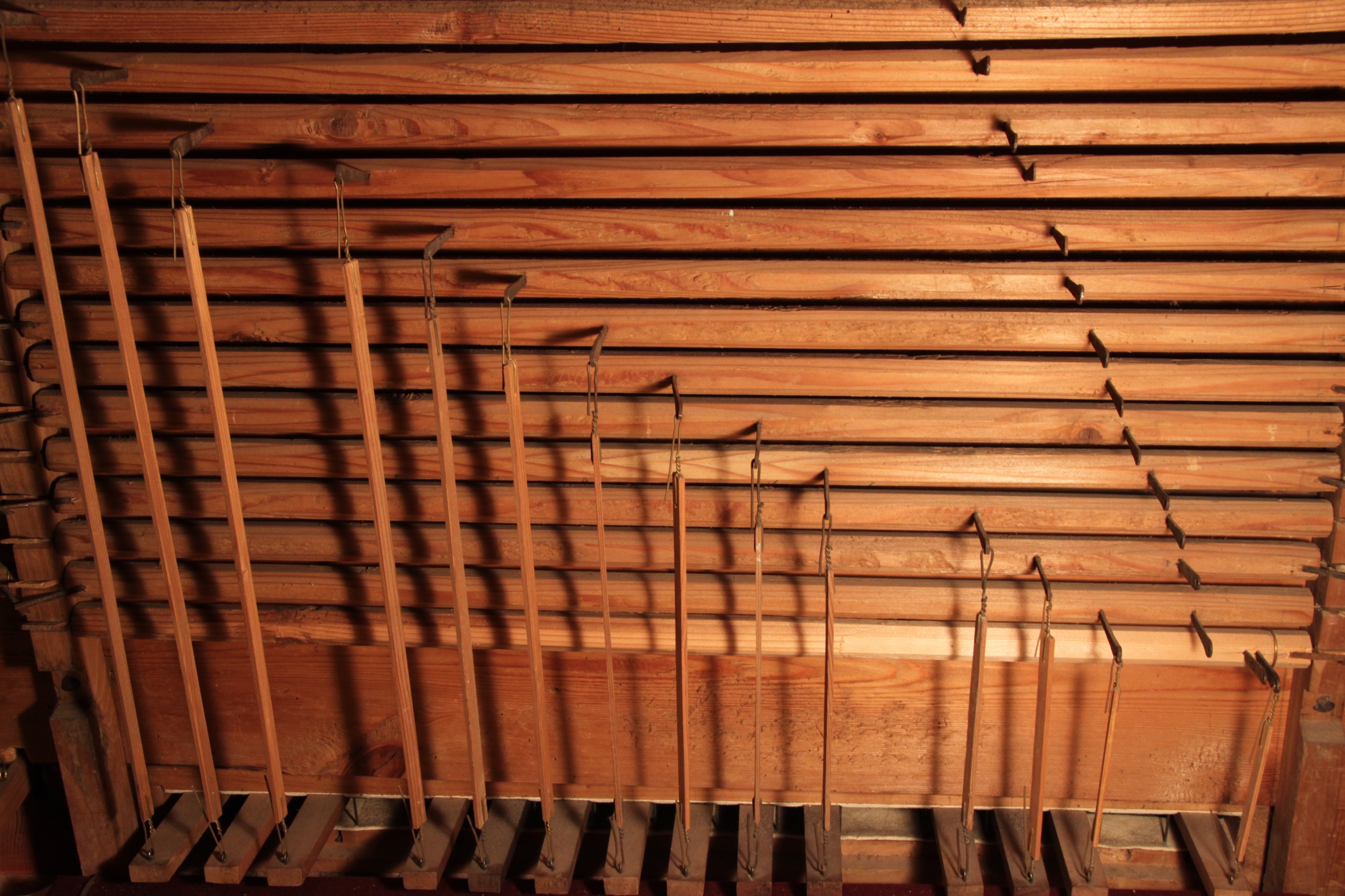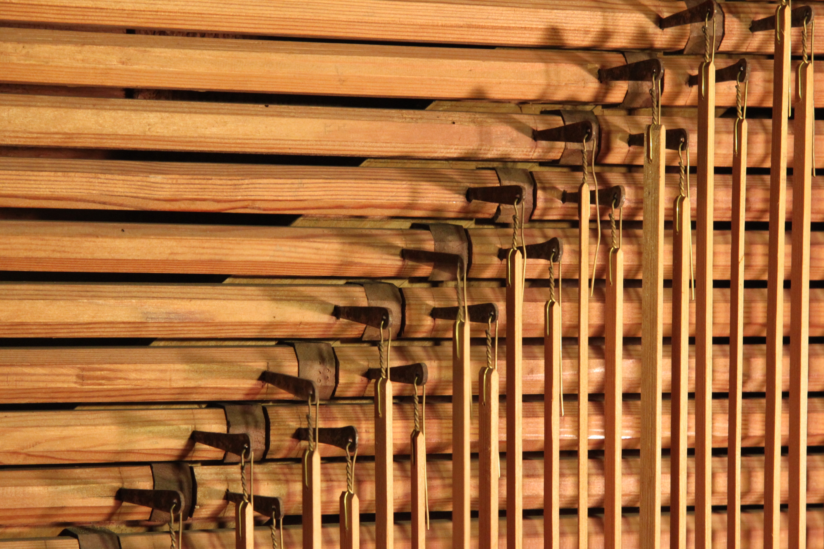 Tirage des notes du clavier manuel : l’abrégé transmet le mouvement des touches du clavier vers les soupapes du sommier. Celles-ci sont enfermées dans la laye (en haut à droite de l’image, caisson garni de bandes de peau blanche pour l’étanchéité). A chaque note correspond une soupape, dont l’ouverture libère le vent dans une gravure du sommier. Tout en haut de l’image, le « plafond » du soubassement est constitué par le fond du sommier (ici, côté ut), dont l’étanchéité est assurée par des parchemins provenant d’anciens antiphonaires. Ces parchemins anciens ont pu être entièrement conservés lors de la restauration des sommiers en 1982. A travers le parchemin, on aperçoit les barrages en noyer (bois sombre) séparant les gravures, dont le fond est fermé par un flipot en peuplier (bois clair).