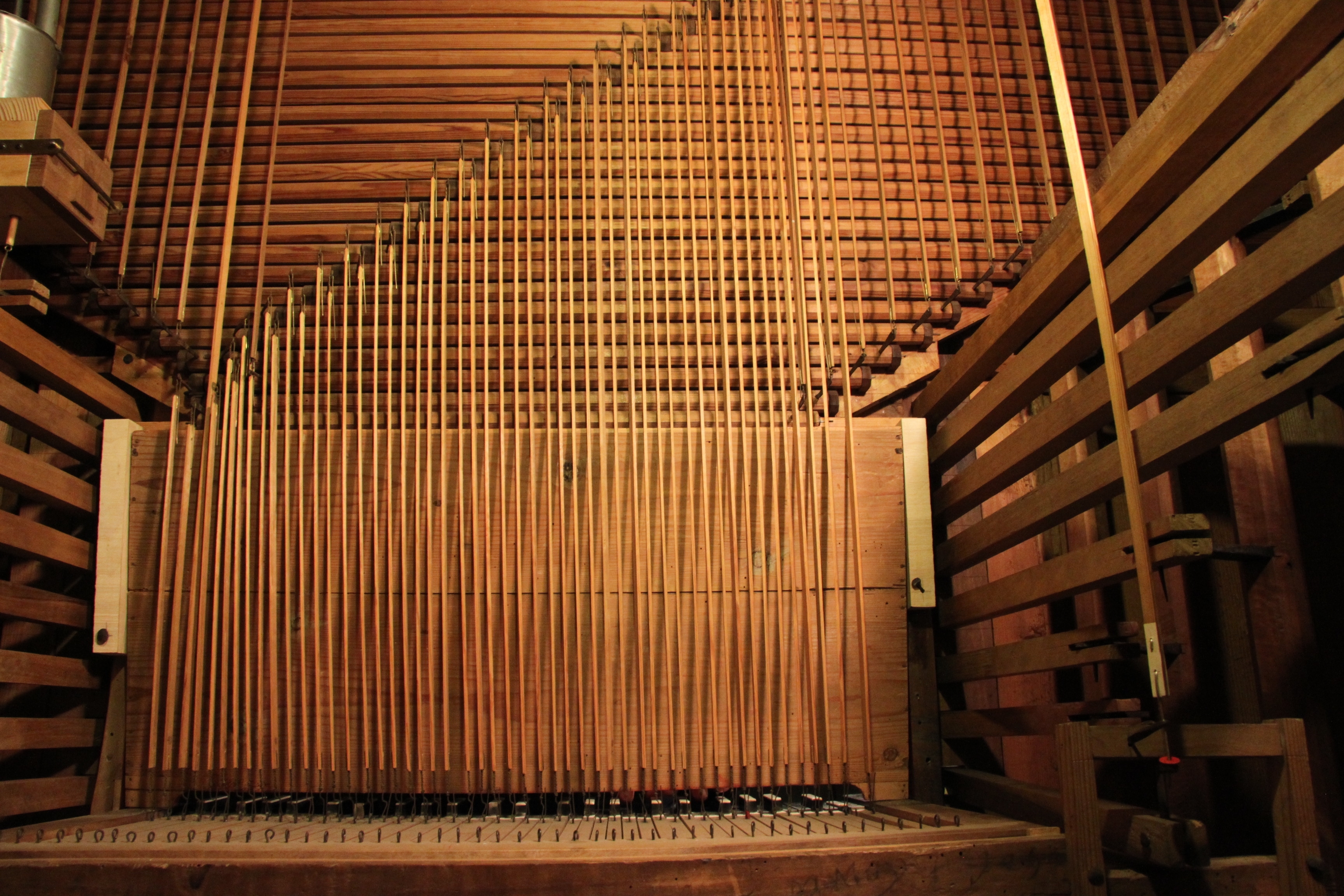 Tirage des notes : les touches du clavier sont suspendues par des vergettes (verticales) aux rouleaux (horizontaux) de l’abrégé. En pivotant autour de leur axe, ceux-ci vont transmettre le mouvement, par une seconde série de vergettes, aux soupapes des sommiers. Tirage des jeux : à gauche et à droite du clavier, les tirants de registres.