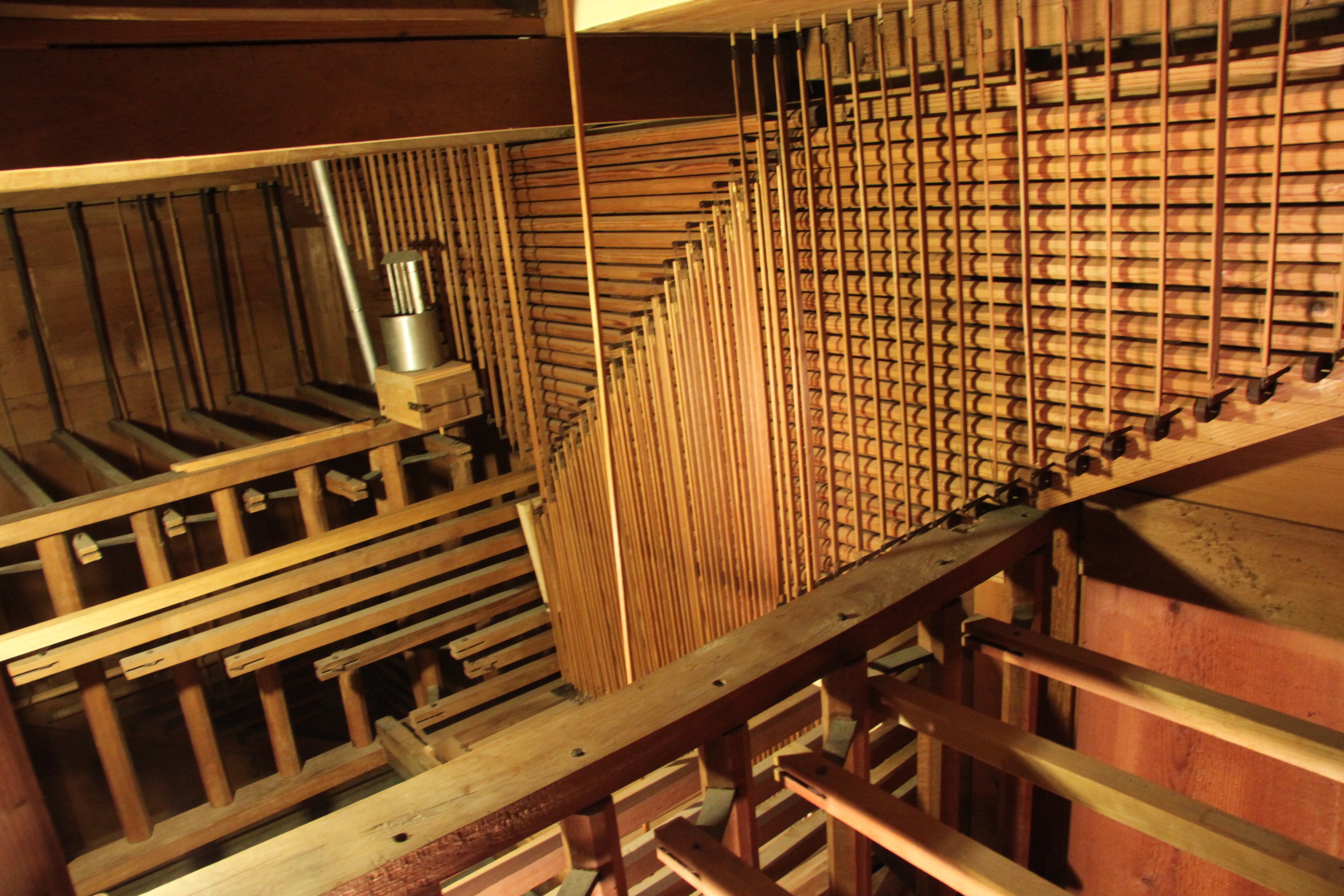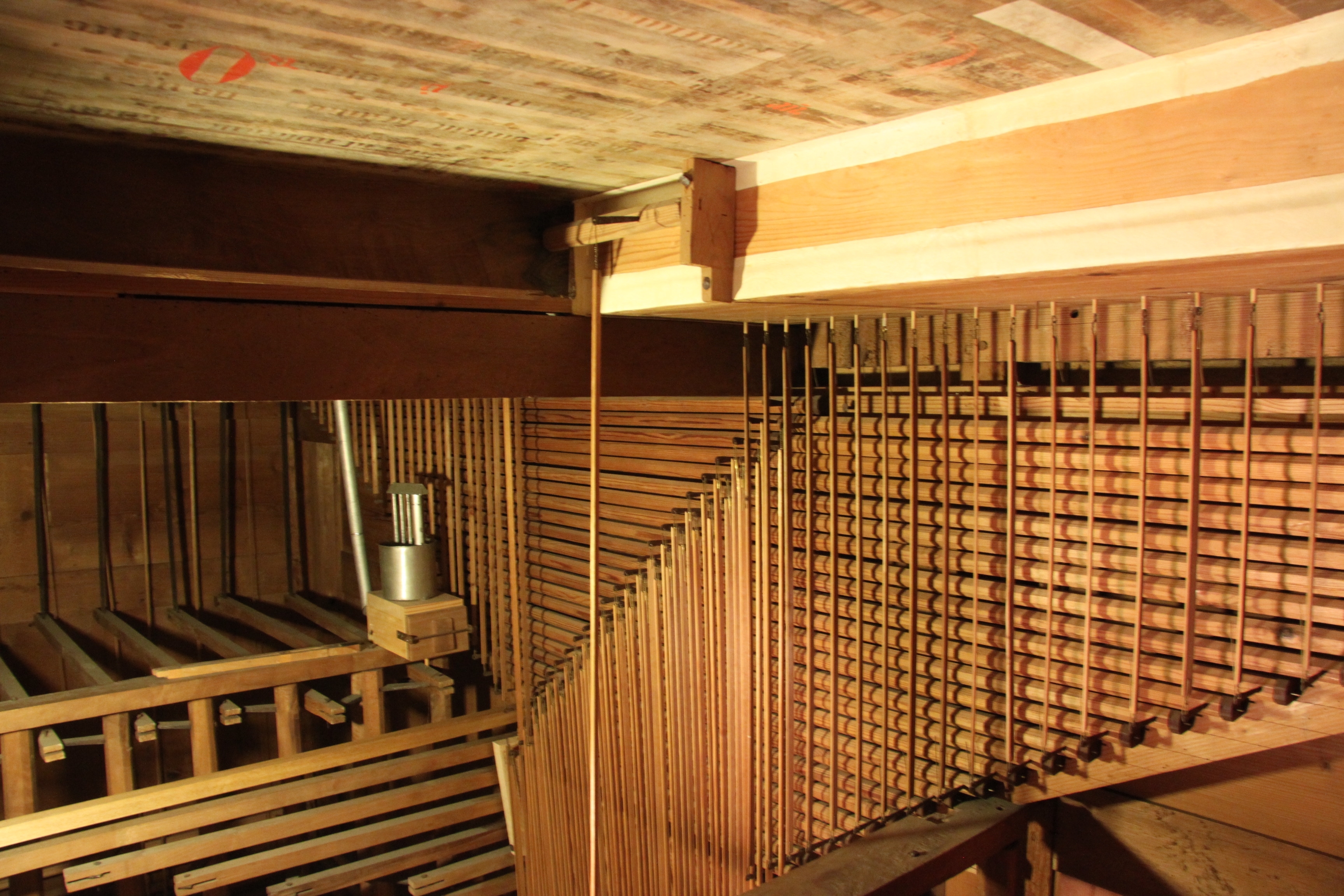 Dans le soubassement de l’orgue : vue d’ensemble des transmissions