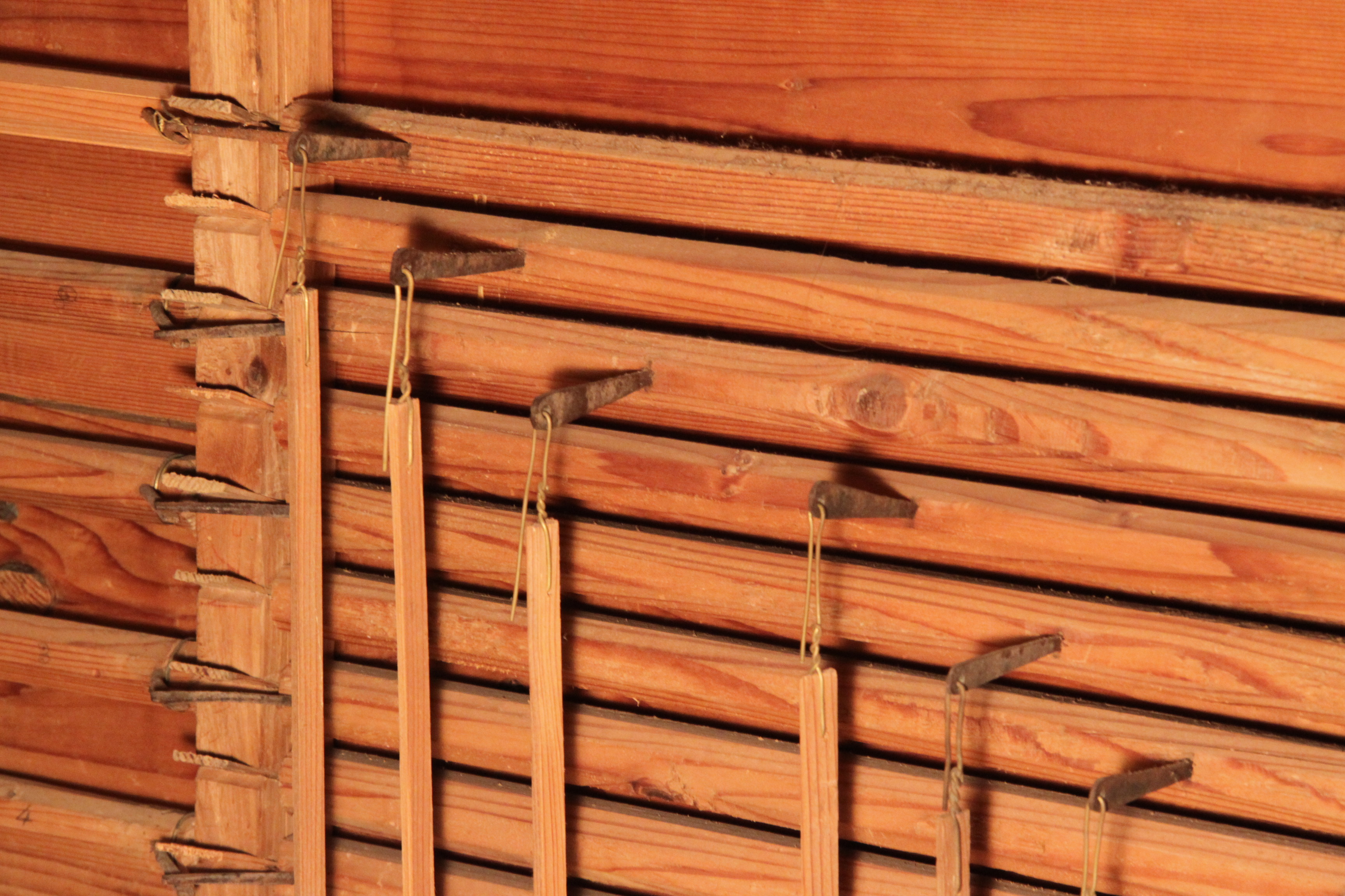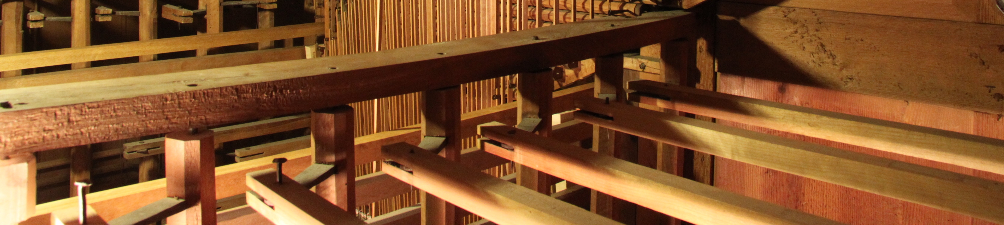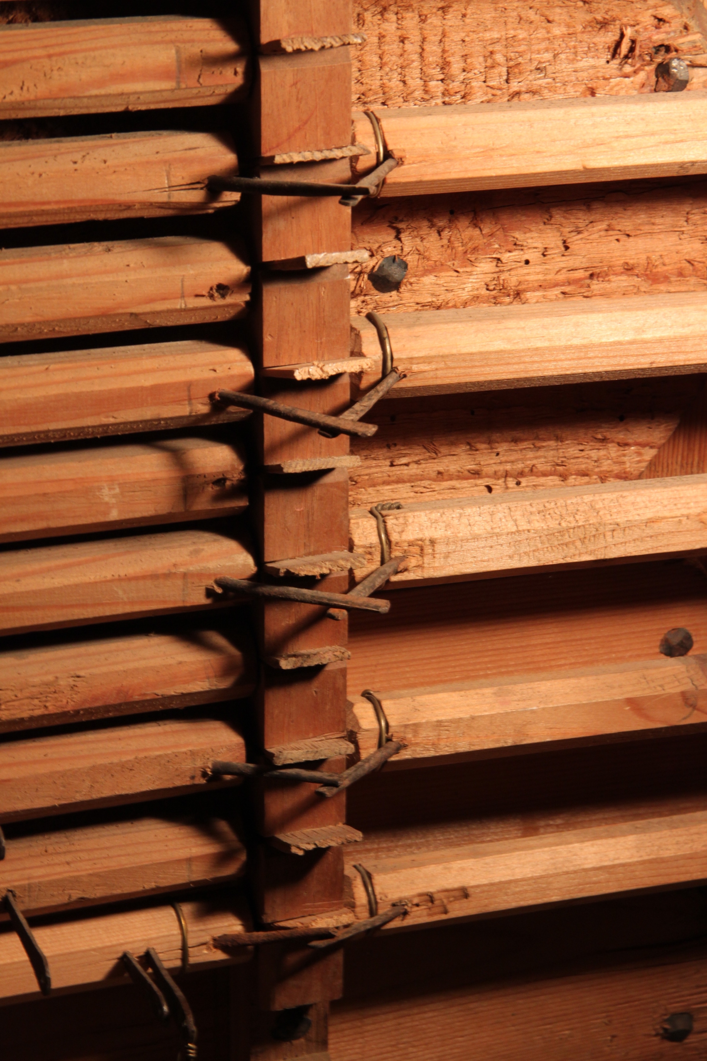 | Chaque marche du clavier de Pédale est suspendue à un rouleau d’abrégé. L’abrégé de Pédale devant transmettre le mouvement aux sommiers de Pédale disposés transversalement derrière les deux grandes tourelles, les rouleaux d’abrégé sont divisés en trois longueurs successives. La première (à l’aplomb du clavier) transmet son mouvement à la deuxième (image de droite) au moyen fort simple de deux fers fichés obliquement, l’un poussant l’autre. Un rouleau sur deux est ainsi prolongé à droite (côté ut, montré ici), et un rouleau sur deux à gauche (côté ré, image ci-dessous). Autrefois, la Pédale tirait aussi les notes graves du clavier manuel. Cette tirasse n’a pas été rebranchée lors de la restauration de 1982. |
