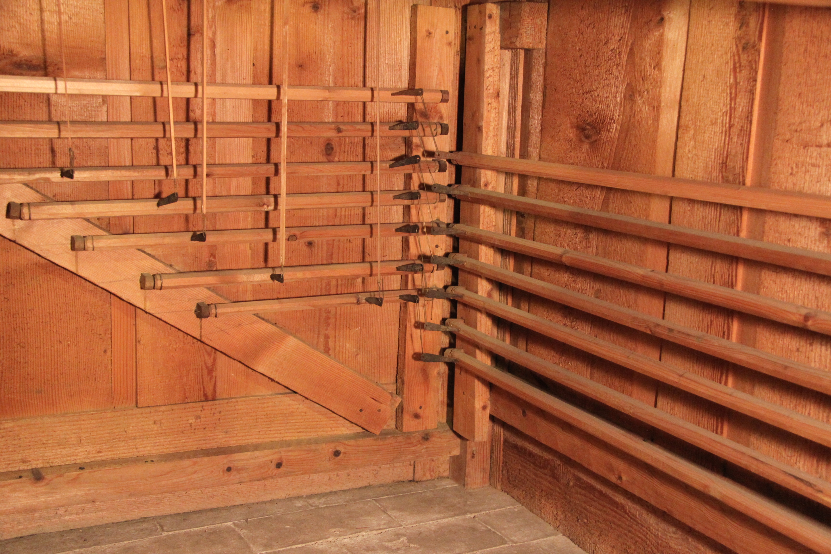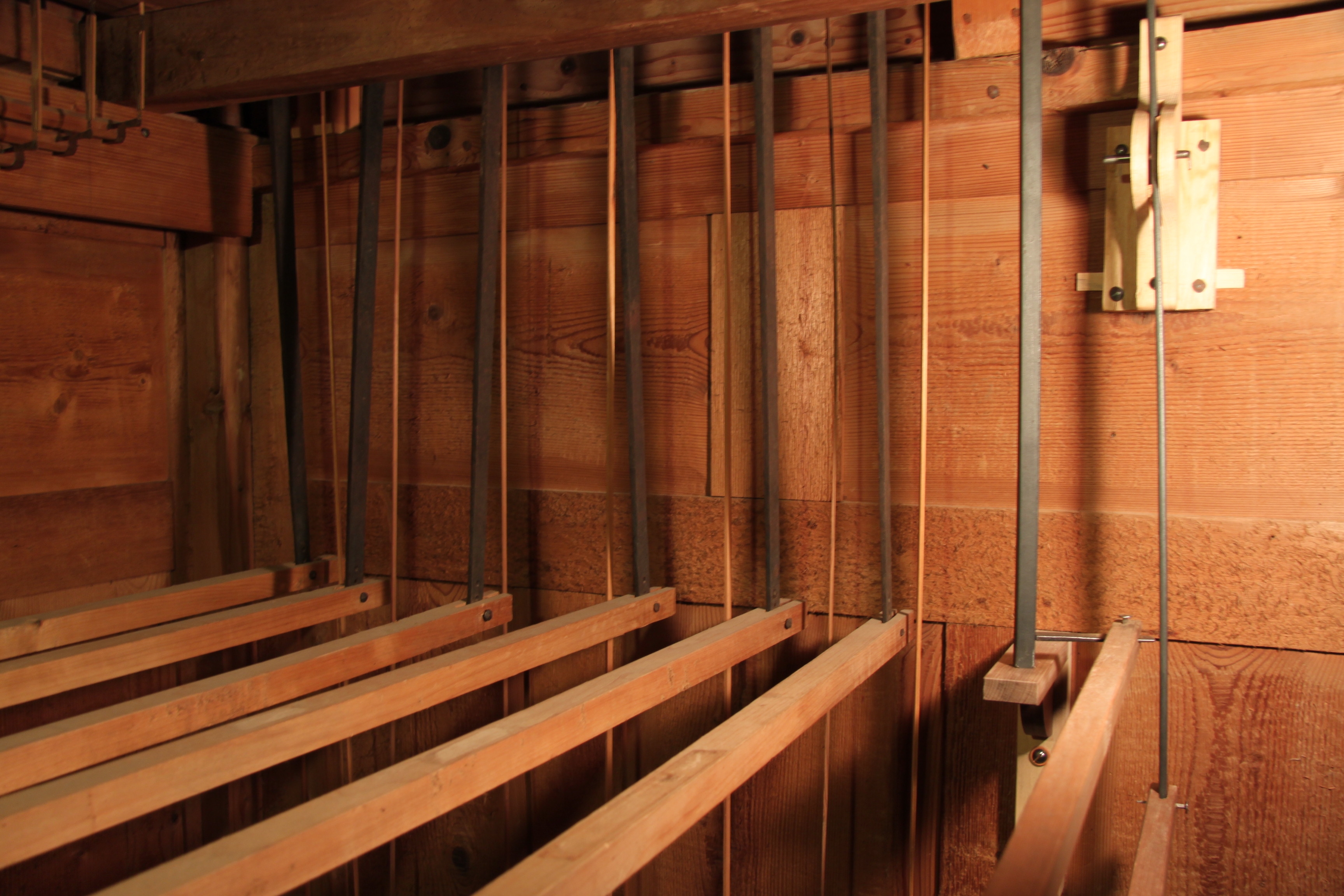 | A gauche de l’image, le tirage des jeux côté ré. Les tirants de registres (section carrée, longueurs croissantes de bas en haut) actionnent des pilotes tournants (verticaux, de section octogonale). Ceux-ci, par un bras en fer engagé dans un enfourchement, commandent à distance des balanciers en fer (verticaux, tout au fond à gauche, à l’aplomb de l’extrémité du sommier). Chaque balancier commande l’ouverture ou la fermeture d’un registre. En bas à droite de l’image (et détail ci-dessous) : pilotes tournants, bras et enfourchements côté ut. |