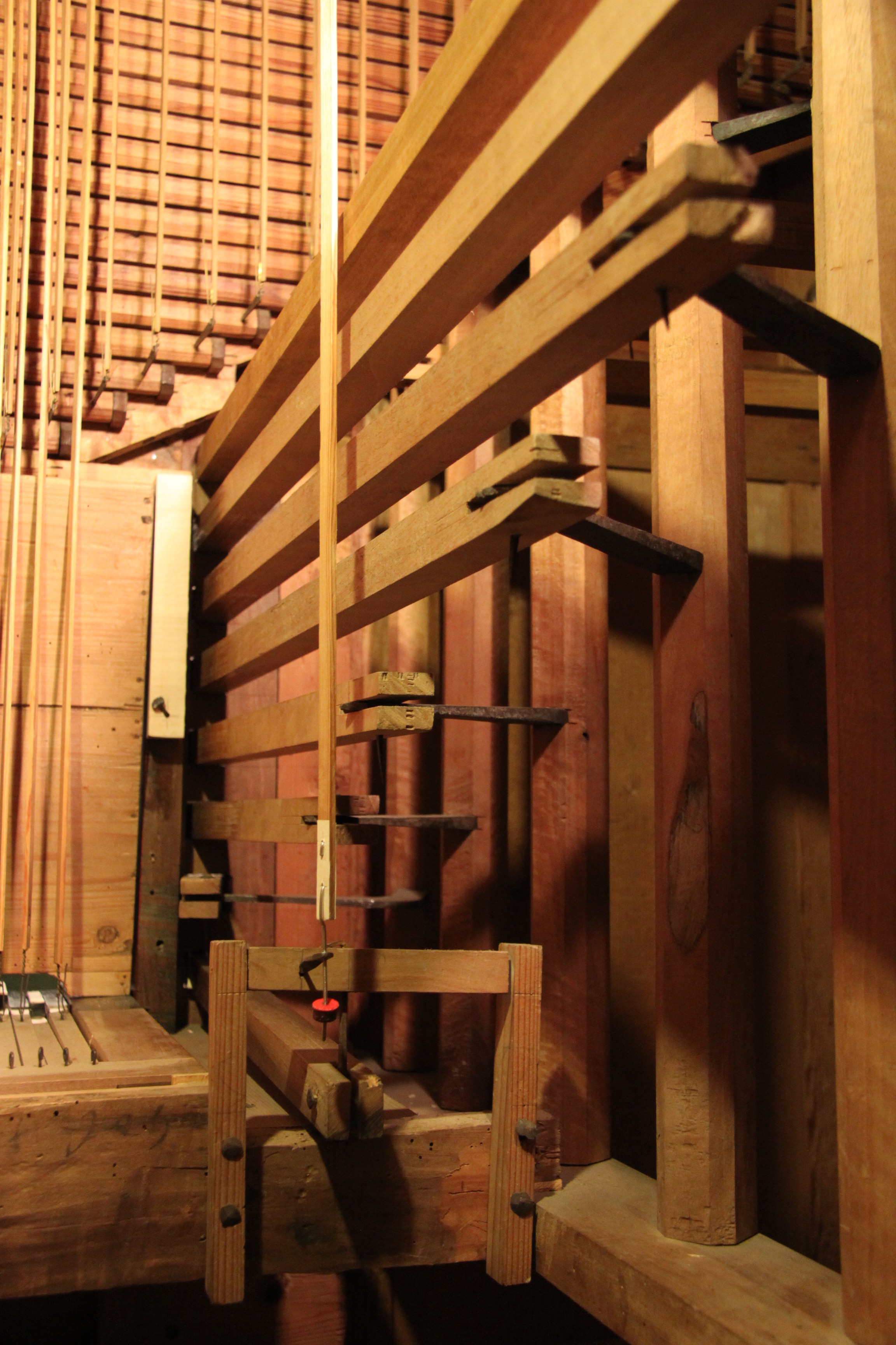 Au premier plan, le tirage des jeux côté ut (tirants de registres, pilotes tournants et départ des mouvements vers les balanciers). Au fond à gauche, le tirage des jeux côté ré. Entre les deux, le tirage des notes du clavier manuel est entièrement situé dans un plan vertical (mécanique directe suspendue). Le mouvement des touches du clavier (en bas et au centre de l’image) est transmis aux layes des sommiers (tout en haut de l’image) par l’intermédiaire de l’abrégé. |